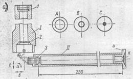Центрировка зеркала или призмы в оправе может быть осуществлена различными методами. Простейший способ центрировки выполняется при помощи двух трубок I и II(рис. 7, a) без объективов и окуляров, ввинчиваемых в базовые резьбы 5 и 4 корпусов 3 и 5 призмы (рис. 5, а и в). Трубки имеют сетки А, В и С, находящиеся на конечных расстояниях от юстируемой призмы (или зеркала). Сетка 1 имеет черный кружок; па сетке 2 нанесено черное кольцо; сетка 3 имеет, также черное кольцо диаметром, промежуточным между диаметром чёрного кружка и кольцом сетки 2.