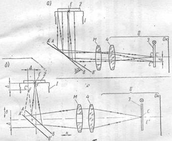 Удобно комбинированное оптическое устройство, позволяющее определять и наклон и параллельное смещение зеркала или призмы (рис. 8). Вместо сетки 1 трубки II (рис. 7, в) в трубке I (рис. 8, а) устанавливается зеркало 2 с маркой Е в центре Микроскоп I (рис. 7,в) заменяется автоколлимационной трубкой II с объективной насадкой М, имеющей круглое отверстие (рис. 8, а). При освещении сетки трубки II в торец лучи выйдут из объектива параллельными пучками и, пройдя отверстие в насадке отразятся от юстируемого зеркала А В и зеркала 2 (рис. 8, а).