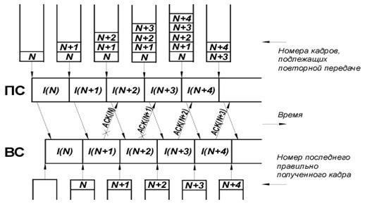 , эффективность понижается также, как и в методе выборочной повторной передачи, если не считать того, что при возникновении ошибки повторной передаче подлежат два кадра: искаженный и непосредственно следующий за ним, т.е.