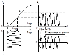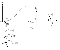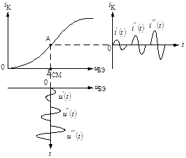 Даже самые малые электрические возмущения в схеме (включение, флуктуации) вызывают нарастание колебаний. Вначале амплитуда первой гармоники выходного тока i К растет почти пропорционально амплитуде входного напряжения u БЭ (t), а затем ее рост вследствие нелинейности характеристики замедляется и прекращается вовсе. В схеме автогенератора наступает установившийся режим.