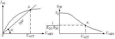 Характеристика S СР (Um БЭ ) описывает свойства нелинейной части схемы автогенератора. Прямая обратной связи, проведенная на уровне S СР = 1/К ОС R Э0 определяет свойства линейной части схемы. Точка А пересечения этих зависимостей определяет амплитуду стационарных колебаний Um СТ , для которой выполняется условие баланса амплитуд. Участок характеристики средней крутизны, для которой Um БЭ < Um СТ , можно назвать областью возбуждения колебаний, а участок, где Um БЭ > Um СТ – областью затухания колебаний.