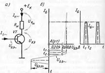 в цепи базы протекает пульсирующий ток. Постоянную составляющую создает источник смещения, а переменную — источник входного напряжения. Мощность, потребляемая от источника входного сигнала,