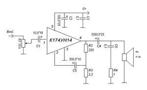 Микросхема К174УН14(TDA2003) предназначена для работы при напряжении источника питания 8-18 В и сопротивлении нагрузки не менее 2 Ом. При этом достигается равномерное усиление сигнала в полосе частот 30 Гц - 20 кГц, а ток покоя составляет 40-60 мА. Чувствительность усилителя - около 50 мВ. Микросхема снабжена собственным теплоотводом, допускающим работу с выходной мощностью не более 2 Вт. Для получения большей мощности обязательно требуется установка дополнительного пластинчатого либо ребристого или игольчатого радиатора.Коэффициент усиления во всей полосе воспроизводимых частот стабилизирован за счет наличия на выходе усилителя делителя напряжения сигнала 1:100 и подачей с него напряжения отрицательной обратной связи на инверсный вход усилителя.