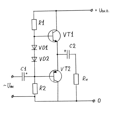 Схема построена на двух комплиментарных транзисторах типа КТ815 и КТ814. Для уменьшения потребляемой мощности каскад питается от однополярного источника напряжения +12В. в схеме применены разделительные конденсаторы С1 и С2 обеспечивающие гальваническую развязку с предварительным усилителем и нагрузкой, а также выполняющих роль фильтра ВЧ со спадом 20 Дб/дек на частотах f<fН . С1 расчитываем исходя из сопротивления нагрузки. С помощью диодов VD1и VD2 создается компенсационное смещение на базах транзисторов для исключния в выходном сигнале искажений типа “ступенька” которая образуется вследствии нелинейности вольт-амперных характеристик (ВАХ) базово-эмиттерного перехода транзисторов. Резисторы R1 и R2 задают рабочую точку транзисторов и диодов. Для одинакового усиления положительной и отрицательной полуволн входного сигнала необходимо использовать транзисторы с одинаковым коэффициентом передачи тока, а также эти транзисторы должны образовывать комплиментарную пару имея разную структуру.