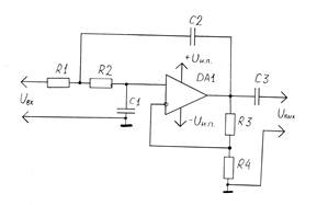 Принципиальная схема предварительного усилителя-фильтра представлена на рис. 3.2. он построен в виде фильтра Баттерворта (низкой частоты) с коэффициентом усиления по напряжению больше единицы, он задается с помощью резисторов R3 и R4. Ввиду того, что требуемый спад амплитудо-частотной характеристики (АЧХ) на частотах f >fВ должен быть больше 20 Дб/дек, будет использован фильтр Баттерворта второго порядка, который имеет спад 40 Дб/дек. Элементы С1, С2 и R1 и R2 рассчитываются согласно методу приведенному в [1] для частоты среза fВ . Операционный усилитель (ОУ) питается от двуполярного источника питания ± 12В. В качества ОУ выбран кристал К140УД7, обладающий хорошими частотными характеристиками, большим коэффициентом усиления и малым входным током. Причина выбора будет подробно рассмотрена в п. 4.3.