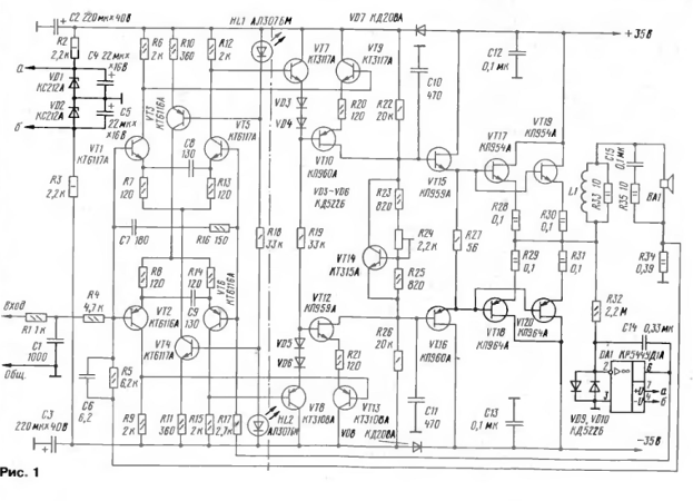 При налаживании усилителя (сначала без мощных транзисторов VT17, VT18, см. рис. 2) его включают и, подав сигнал от генератора, убеждаются в работоспособности устройства без нагрузки. Затем, подключив выходные транзисторы, проверяют его под резистивной нагрузкой как с помощью синусоидального сигнала, так и сигнала "меандр" до частоты 20 кГц. Выходной сигнал должен быть чистым, без какого-либо выброса или "звона". Особое внимание следует обратить на форму выходного сигнала при выходе усилителя из перегрузки по напряжению. На синусоидальном сигнале не должно быть никаких признаков даже кратковременного возбуждения.