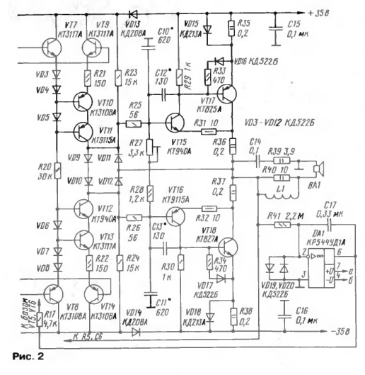 Двухтактный выходной каскад на VT15—VT18 выполнен по схеме ОЭ-ОЭ с глубокой ООС. Цепь смещения на диодах VD9, VD10 дополнена резисторами R23, R24, которые обеспечивают малые изменения входного сопротивления каскада и тока через диоды VD9, VD10 даже при отсечке тока в противоположном плече каскада.