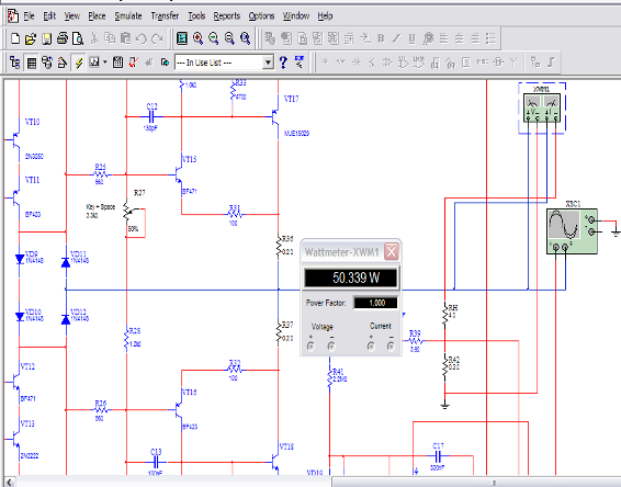 В данной работе, с помощью современных средств проектирования и разработки электронных схем, промоделирована работа схемы усилителя мощности звуковой частоты на зарубежных аналогах отечественных элементов, а также на созданных в процессе работы моделях отечественных активных элементах. Для данной схемы были получены ее основные характеристики (АЧХ, ФЧХ, коэффициент искажений, переходная характеристика и другие), а также зависимость амплитудно-частотной и фазо-частотной характеристик от температуры и параметра регулировочного элемента (резистора, определяющего ток покоя транзисторов выходного каскада). Перечисленные анализы были проведены как для схемы на импортных аналогах, так и на отечественных моделях. Для сравнительного анализа характеристик импортных и отечественных транзисторов и диодов были построены их вольт-амперные характеристики с помощью программы PSpice. В качестве среды для моделирования работы схемы применялась программа Electronics Workbench Multisim8.