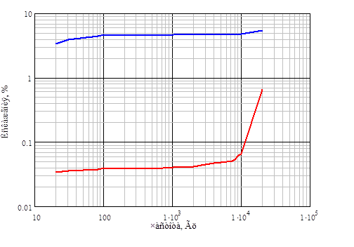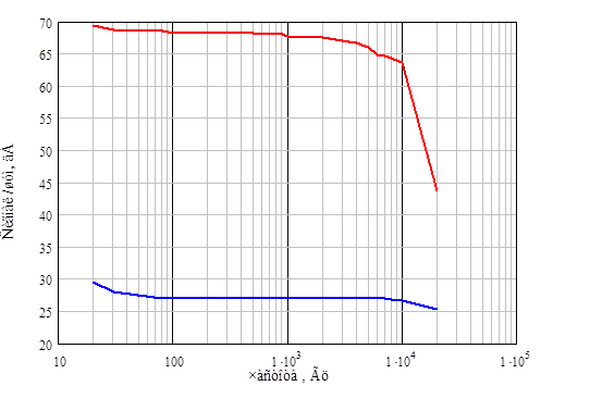 Рис.13. Зависимость нелинейных искажений от частоты (красным – усилитель, собранный на моделях, синим – на аналогах)