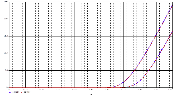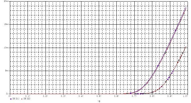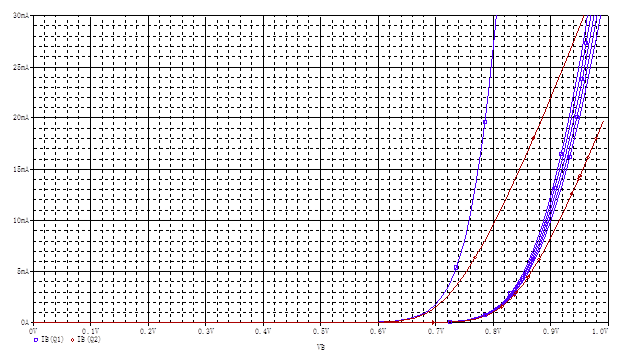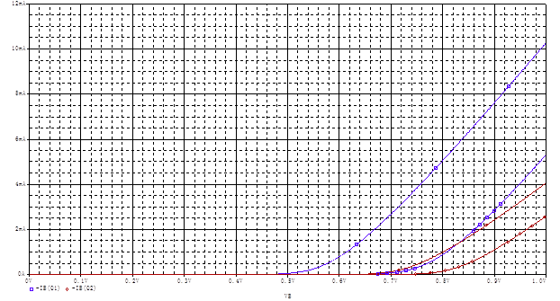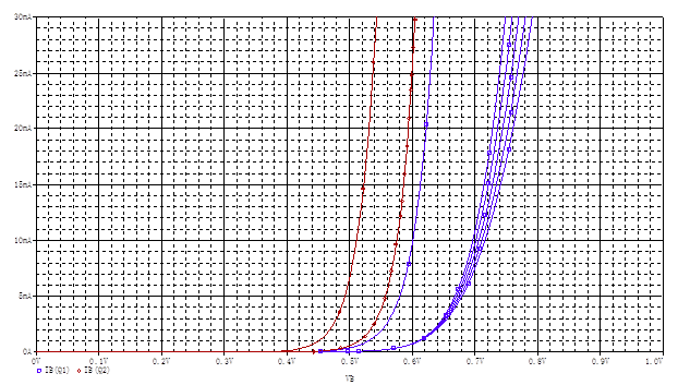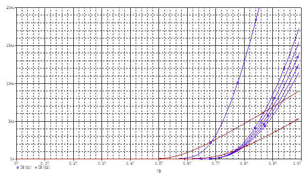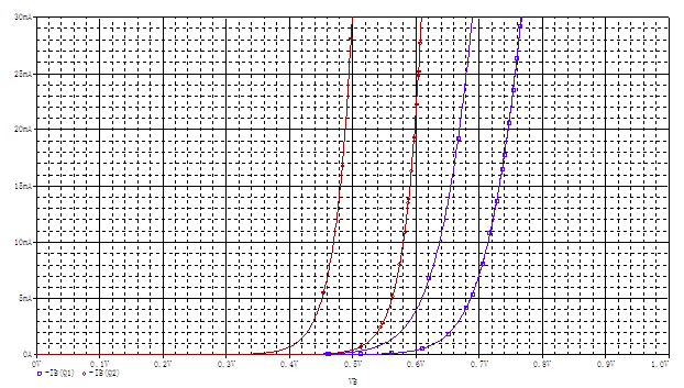 Входные ВАХ транзисторов VT8, VT10, VT14 (Q1 – 2N3250 (синим), Q2 – КТ3108A (красным))