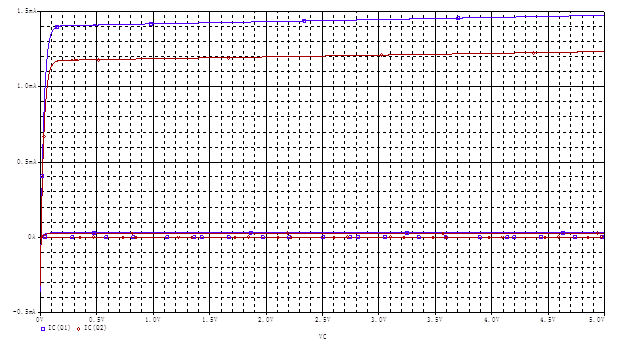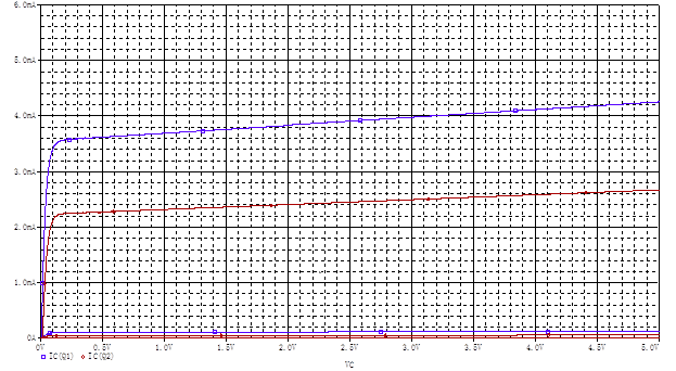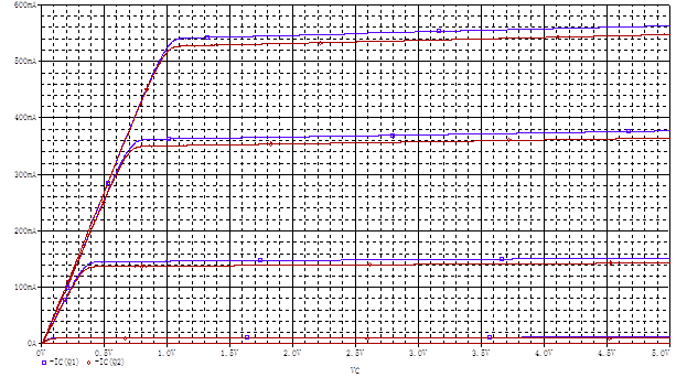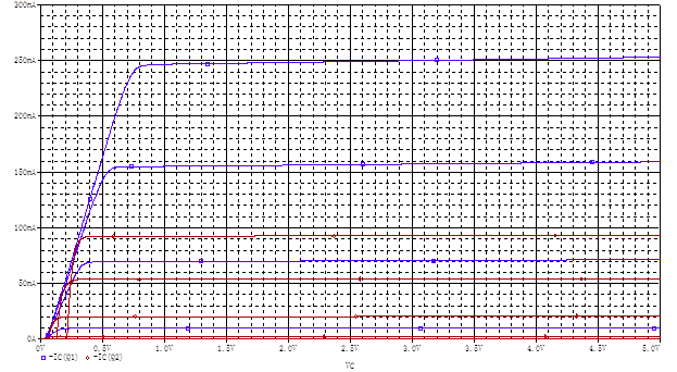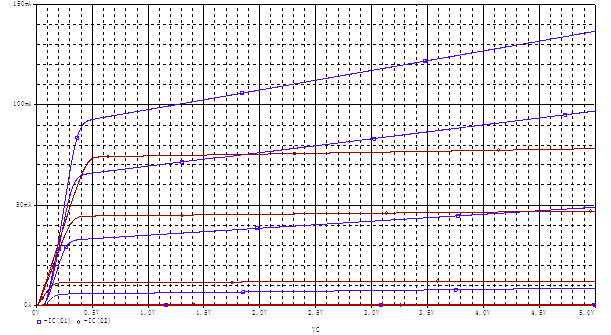 Выходные ВАХ транзисторов VT8, VT10, VT14 (Q1 – 2N3250 (синим), Q2 – КТ3108A (красным))
