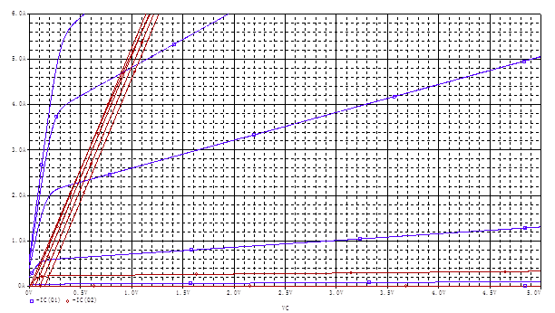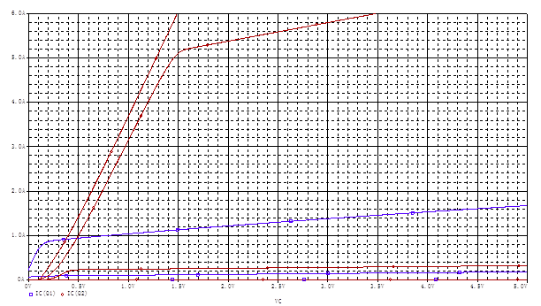 Выходные ВАХ транзисторов VT2, VT3, VT6 (Q1 – 2N5401 (синим), Q2 – КТ6116A (красным))