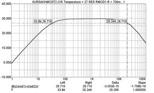 В приложении C приведена АЧХ УМЗЧ при трех температурах (10, 27 и 60°С), показана полоса пропускания по уровню 0.7 (а в дБ уровень 0.7 соответствует –3дБ от максимального коэффициента передачи). Более точная настройка полосы усилителя осуществляется конденсаторами С2 и С3.