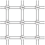 Германий и кремний - элементы четвертой группы периодической системы Д.И. Менделеева, т.е. являются четырехвалентными элементами. В валентной зоне каждого атома германия и кремния имеется по четыре валентных электрона. Германий и кремний имеют атомные кристаллические решетки. Связь между атомами в таких решетках парноэлектронная или ковалентная. Каждый атом в них связан с соседним двумя электронами - по одному от каждого атома. Схематическое изображение кристалла германия на плоскости показано на рис.1. Каждый атом в монокристалле германия окружен четырьмя соседними атомами, с которыми он связан парноэлектронными связями. В результате валентная оболочка каждого атома имеет восемь электронов, т.е. оказывается полностью заполненной. В таком кристалле все валентные электроны связаны между собой прочными парноэлектронными связями. Свободных электронов, которые могли бы участвовать в переносе зарядов, нет.