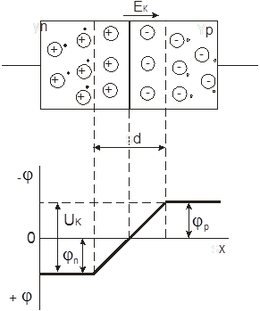 Между образовавшимися объемными зарядами возникают так называемая контактная разность потенциалов: uK = φn - φp и электрическое поле, направленное от n - области к p - области.