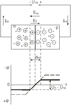 Если к p-n - переходу приложено внешнее прямое напряжение Uпр , то создаваемое им внешнее электрическое поле Eпр оказывается направленным навстречу электрическому полю p-n - перехода -Eк . В результате этого высота потенциального барьера понижается на величину внешнего напряжения. Одновременно уменьшается толщина запирающего слоя (dпр < d) и его сопротивление в прямом направлении становится малым. Так как высота потенциального барьера понижается, возрастает диффузионный ток, так как большее число носителей зарядов может преодолеть пониженный барьер. Ток дрейфа при этом почти не изменяется, так как он зависит главным образом от числа не основных носителей, попадающих за счет своих тепловых скоростей на p-n - переход из p - и n - областей.