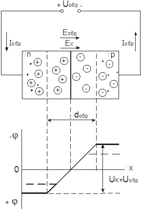 Под действием обратного напряжения Uобр через переход протекает очень небольшой обратный ток Iобр , что объясняется следующим образом. Поле, создаваемое обратным напряжением Eобр , складывается с полем контактной разности потенциалов Eк . В результате этого потенциальный барьер повышается, а толщина самого запирающего слоя увеличивается (dобр > d). Этот слой еще сильнее обедняется носителями, и его сопротивление значительно возрастает, т.е. Rобр >> Rпр .