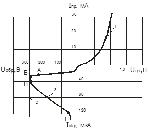 Рисунок 7 - Вольт-амперная характеристика p-n - перехода: 1 - прямая ветвь; 2 - обратная ветвь при лавинном пробое; 3 - обратная ветвь при тепловом пробое