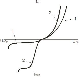Прямую 1 и обратную 2 ветви ВАХ изображают в различном масштабе, поскольку в нормальном режиме работы p-n - перехода обратный ток на несколько порядков меньше прямого.