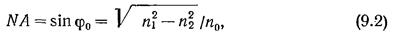 Если на торец ступенчатого волокна (рис. 9.1) из среды с показателем преломления n0 поступает поток излучения, то по закону отражения - преломления совместно для поверхностей торца и границы сердцевина - оболочка