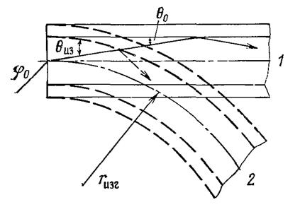 - соответственно абсолютная и относительная разности показателей преломления сердцевины и оболочки. Изгиб световода приводит к тому, что угол между лучом и границей раздела сердечник — оболочка возрастает