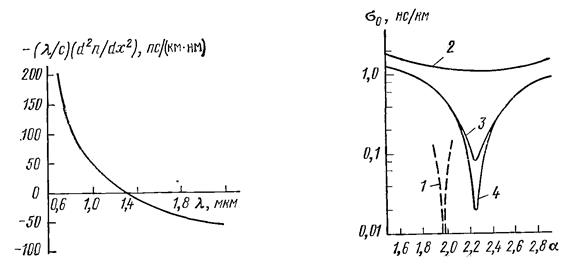 Экспериментальная дисперсионная кривая для кварца, легированного фосфором (материал сердечника практически всех основных типов световодов для ВОЛС), представленная на рис. 9.3,. показывает, что при λ≈3 мкм