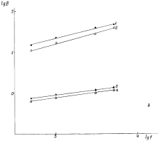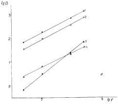 Залежності яскравості B від частоти f (мал. 1.3, а, b) для структур з товщиною шару композиційного рідкого діелектрика dk = 40µm свідчать про те, що на ділянці різкого зростання ВЯХ для структури на шорсткій підкладці характерна лінійна залежність B(f) (показник ступеня б f = 1), а для структури на ”гладкій” підкладці ця залежність носить сублінійний характер з би f = 0.6. На ділянці насичення ВЯХ нахил прямих в координатах lgB — lgf для обох структур практично однаковий з показником ступеня б f = 2/3, що узгоджується з результатами досліджень електролюмінесцентних структур з композиційним рідким діелектриком [5]. Як видно з мал. 9,b, із збільшенням товщини шару композиційного рідкого діелектрика до dk = 100 µm для структур на шорсткій і ”гладкій” підкладках практично однаковий і складає ~ 0.25 для ділянки різкого зростання ВЯХ і ~ 0.55 для ділянки насичення ВЯХ відповідно.