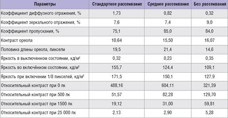 Були класифіковано три основні типи технологічного процесу люмінофорів: стандартний (розсіюючий), з середнім розсіюванням і без розсіювання. У таблицю зведені основні оптичні властивості, отримані з трьома різними типами рецептур люмінофорів ZnS:Mn, реалізованих в QVGA дисплеях.