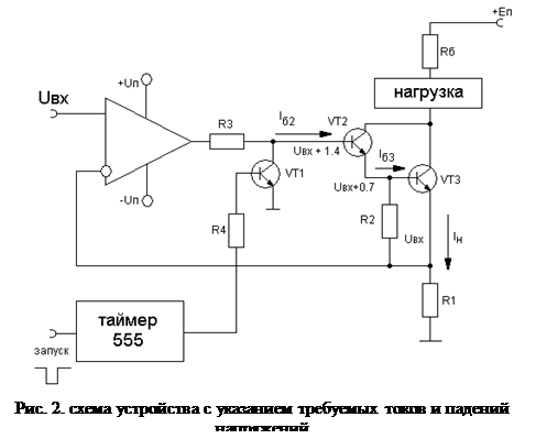 Устройство состоит из операционного усилителя, каскада Дарлингтона и транзистора VT1, сменой режимов которого управляет таймер 555. Транзистор VT1 большую часть времени находится в режиме насыщения, когда из таймера в его базу втекает ток определенной величины. В этом состоянии VT1 работает как низкоомный резистор, понижается потенциал базы VT2, и отключается отрицательная обратная связь, образованная каскадом Дарлингтона (VT2,VT3) и резистором R1.