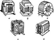 Рисунок 6 - Типичные конструкции однофазных дросселей открытого исполнения: а) - броневой с ленточным магнитопроводом; б) - стержневой с ленточными сердечниками и двумя катушками в) — тороидальный; г) — броневой с сердечником из штампованных пластин; д) - броневой с креплениями из пластмассы.