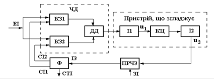 Згладжуючий пристрій містить два послідовно включених електронних інтегратори І1 і І2 і коригувальний RС - ланцюжок КЛ. Електронні інтегратори можна виконати, наприклад, на операційних підсилювачах.