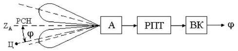 У кутомірних слідкувальних системах, призначених для супроводу однієї цілі, звичайно використовується рівносигнальний метод пеленгування, при якому за допомогою антенної системи (А) формується рівносигнальна зона (РСЗ). Пеленгаційний пристрій (ПП) (рис. 6), що складається з антенної системи, радіоприймального тракту (РПТ) і вихідних каскадів (ВК), вимірює просторову неузгодженість j між віссю РСЗ zА і напрямком на ціль Ц, а виконавчий пристрій ВП змінює кутове положення вісі РСЗ так, щоб усунути наявну неузгодженість.