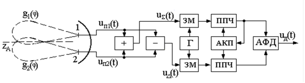 На рис. 7 " + " - суматор сигналів; " - " – обчислювач сигналів; ЗМ – змішувачі; Г – гетеродин; ППЧ – підсилювачі проміжної частоти; АРП – блок автоматичного регулювання посилення; АФД – амплітудно-фазовий детектор; " 1 " і " 2 " – випромінювачі антени; ZA рівносигнальний напрямок антени.