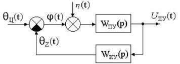 Структурна схема азимутального каналу кутомірної системи (рис. 9) містить блоки з передатними функціями WПУ (s) і WИУ (s) пеленгаційного і виконавчого пристроїв відповідно. Сигнал неузгодженості j є різниця, j=qЦ –– qZ , де qц – напрямок на ціль, qz - напрямок осі Z. Збурювання n(t) є випадковим впливом, обумовлений внутрішнім шумом радіоприймача, перелічене до кутового відхилення.
