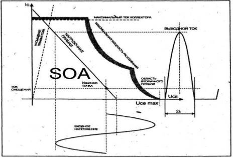 Рис. 3. Зона безопасной работы транзистора (SOA) и диаграмма работы в режиме АВ