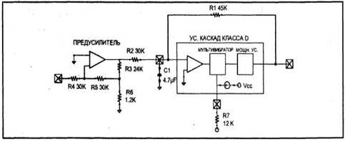 Предварительный усилитель определяет коэффициент усиления всего усилителя (рис. 4). Второй каскад является усилителем мощности класса D с коэффициентом усиления 1,5. Основой усилителя мощности является управляемый мультивибратор, который при отсутствии входного сигнала генерирует меандр. При наличии сигнала на входе, мультивибратор изменяет скважность выходных импульсов. Частота мультивибратора задается напряжением на выводе 9 (для корпуса DIP20) или 6 (для MULTIWATT15).