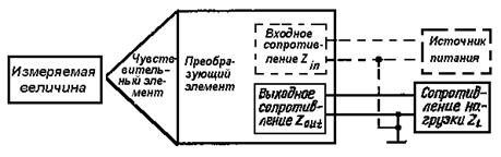 Рис. 1.4. Структурная схема измерительного преобразователя, включающая в себя элементы, общие для всех типов преобразователей. Показанные в пунктирных линиях элементы могут в некоторых преобразователях отсутствовать