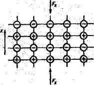 В направлении оси X ионы различных знаков чередуются и взаимно компенсируют свои заряды. При действии на кристалл силы Fх в направлении X кристаллическая решетка деформируется, расстояния между положительными и отрицательными ионами изменяются, и кристалл электризуется в этом направлении. На его гранях, перпендикулярных оси X, появляется заряд: