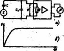 Упрощенная эквивалентная схема пьезоэлектрического преобразователя, соединенного кабелем с вольтметром, представлена на рисунке 2.3а. На этой схеме С - собственная емкость преобразователя; С1 - суммарная емкость соединительного кабеля, входной емкости усилителя и других емкостей, шунтирующих вход усилителя; R -входное сопротивление усилителя. Сопротивления утечки пьезоэлемента и сопротивление утечки кабеля могут рассматриваться на эквивалентной схеме как составляющие сопротивления R.