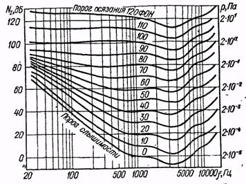 На рис. 1 показаны частотные зависимости кривых равной громкости. Параметром кривых является уровень громкости; каждая кривая показывает, каким образом с изменением частоты должен изменяться уровень интенсивности звука, чтобы громкость синусоидальных сигналов оставалась неизменной.