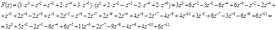 F(10)=x(0)×y(10)+x(1)×y(9)+x(2)×y(8)+x(3)×y(7)+x(4)×y(6)+x(5)×y(5)+x(6)× y(4)+x(7)×y(3)+x(8)×y(2)+x(9)×y(1)+x(10)×y(0) = 0+0+0+0+4+0+0+0+0+0+0 = 4;