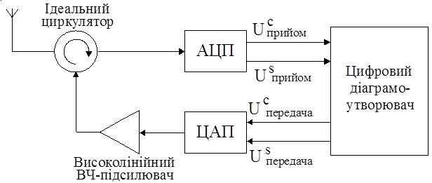 Цифрова антенна решітка – це антенна система, що являє собою сукупність аналого-цифрових каналів із загальним фазовим центром, у якій діаграма спрямованості формується в цифровому виді, без фазообертачів (рис. 1.4). Теоретичні засади такого підходу до побудови антен були закладені ще в 60-70 рр. минулого сторіччя. Однак лише тепер, з розвитком мікропроцесорної техніки, стало можливим практично реалізувати накопичений науковий досвід.