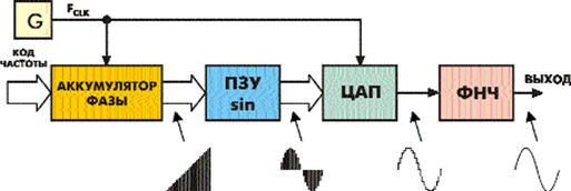 Швидкість зміни фази задається кодом частоти. Далі за допомогою ПЗП фаза, що лінійно змінюється, перетвориться у відліки вихідного сигналу, що змінюються по синусоїдальному закону.