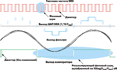 Джерело тактового сигналу DDS є головним джерелом фазових шумів, навіть не дивлячись на ефект їх зменшення в процесі розподілу частоти в DDS.