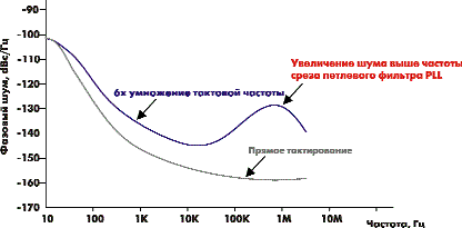 Проте використовування множення тактової частоти не завжди бажане, оскільки при цьому фазовий шум тактового сигналу збільшується в стільки ж разів, в скільки разів умножається частота. Більш того, вище за частоту зрізу фільтру PLL може спостерігатися пік фазових шумів (рисунок 3).