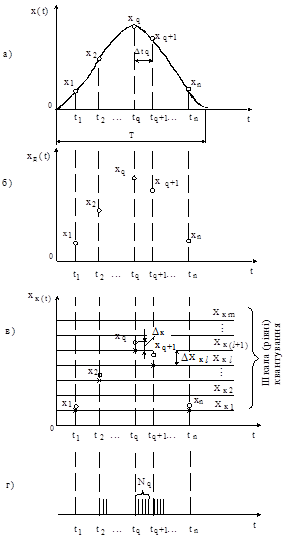 Операція дискретизації зводиться до подання безперервного протягом часу T сигналу x(t) (рис.7.1, а) низкою його миттєвих значень xq = x(tq),