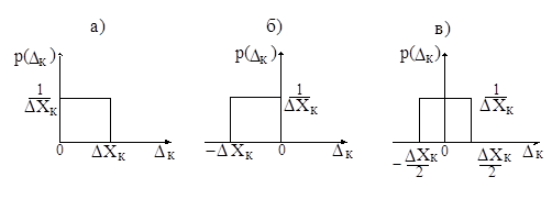 Похибка квантування є випадковою величиною, яка підпорядковується рівномірному закону розподілу. Розташування кривих щільності розподілу похибки квантування та її числові характеристики (максимальне значення, математичне сподівання і середнє квадратичне відхилення) визначаються вибраним варіантом квантування (округлення). На рис.7.2, а, б, в приведені криві