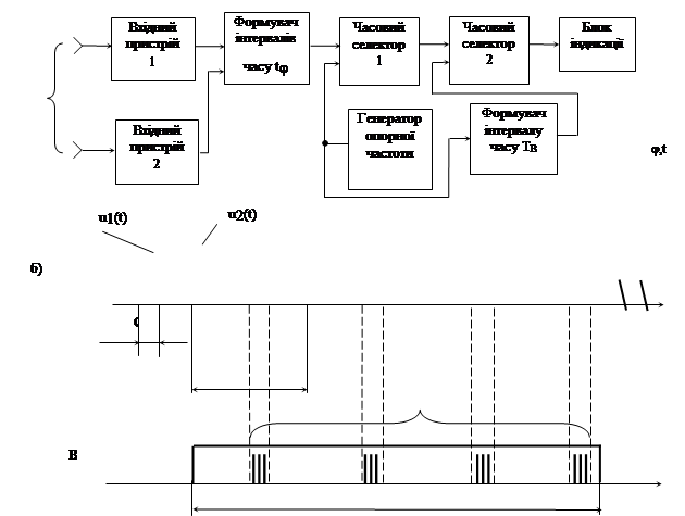 , коли блок керування видає сигнал Пуск (Старт) (рис.7. 19, а). Цим сигналом запускається ГЛЗН і одночасно відкривається часовий селектор, через нього в блок індикації починають надходити імпульси частотою