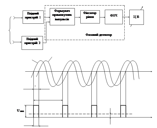 Структурна схема і діаграми роботи фазометра миттєвих значень фазового зсуву показані на рис. 1. Вхідними сигналами фазометра є синусоїдні напруги і з періодом Т і частотою , між якими вимірюється фазовий зсув