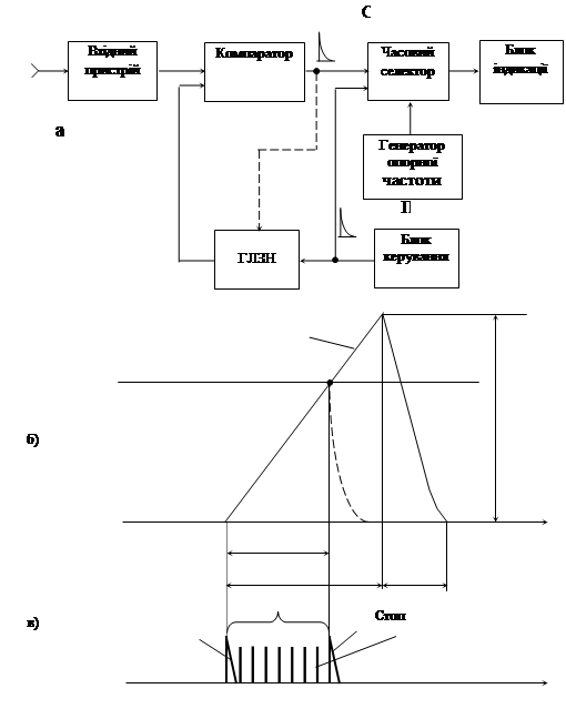 є лінійно зростаючою (рис. 5, б). У початковому положенні ГЛЗН знаходиться в режимі очікування; часовий селектор закритий для проходження імпульсів опорної частоти